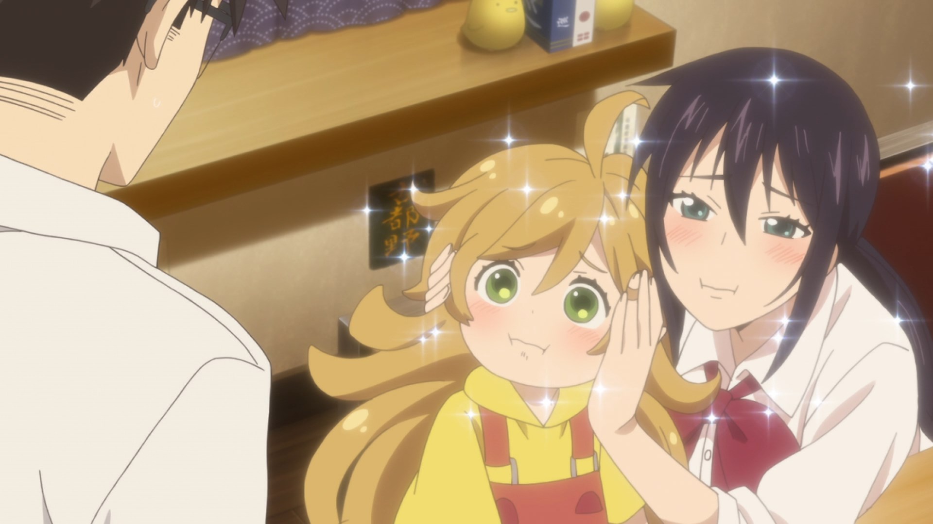 Description: A man and a woman are sitting at a table together in a room with a shelf and a table with a vase.