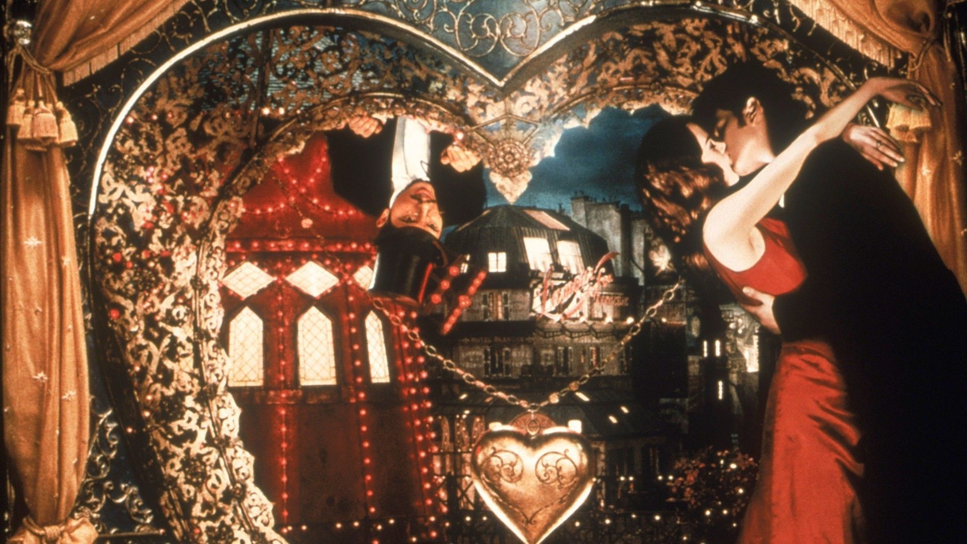 Description: A man and woman in a stage setting with a heart shaped stage behind them and a stage curtain behind them.