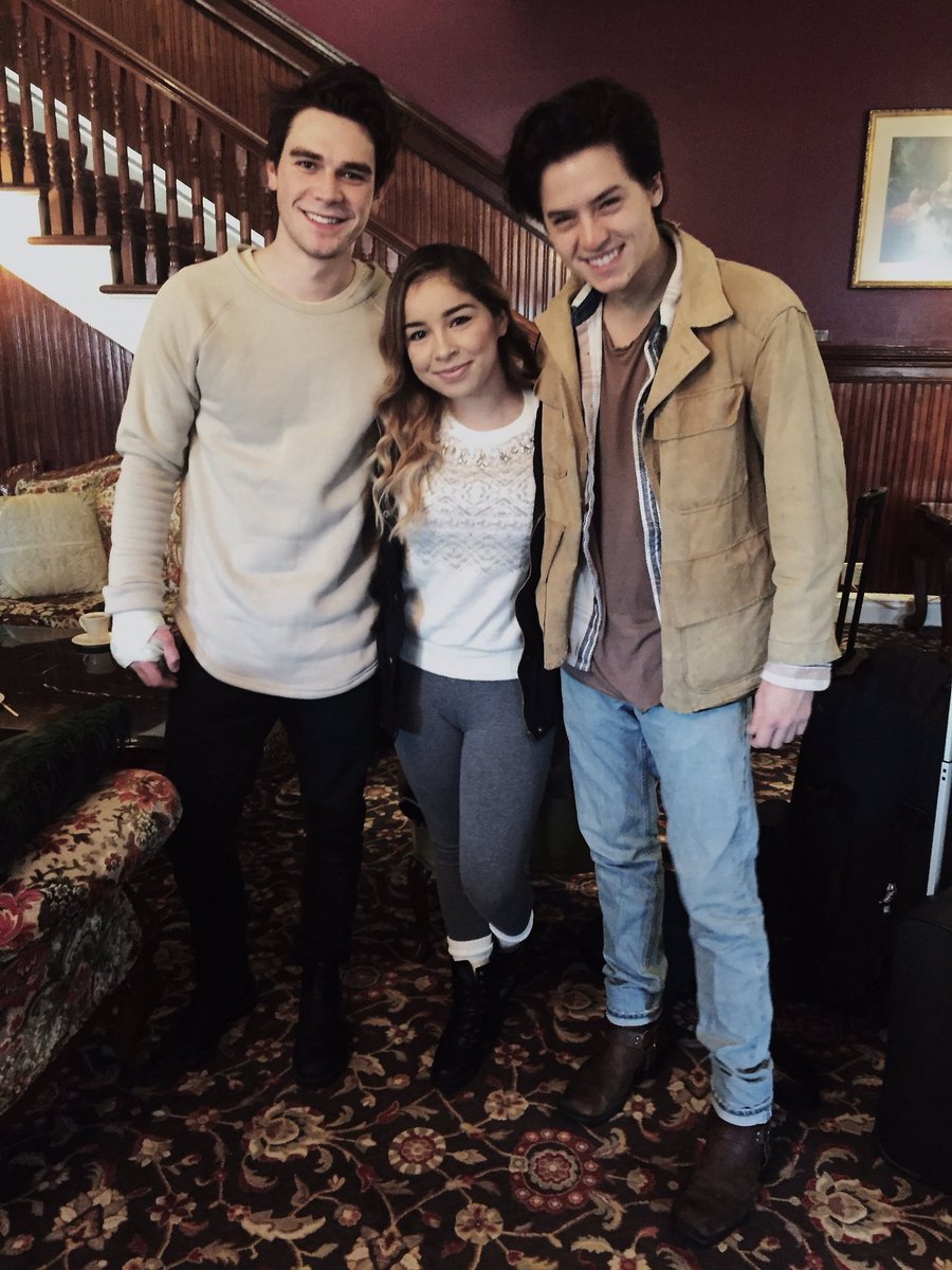 Description: A man and two women standing next to each other in a room with a stair case and carpeted floor.