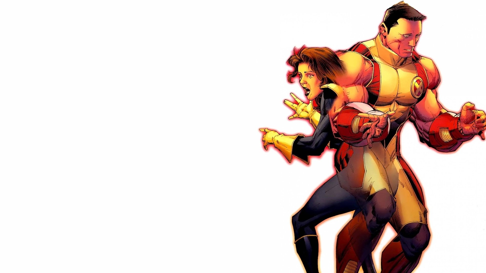 Description: A man and woman are standing next to each other in front of a white background with a red and yellow background.