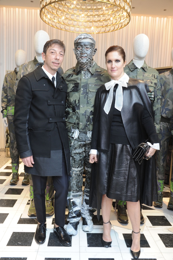 Description: A man and a woman standing next to a statue of a man in uniform and a woman in a dress.