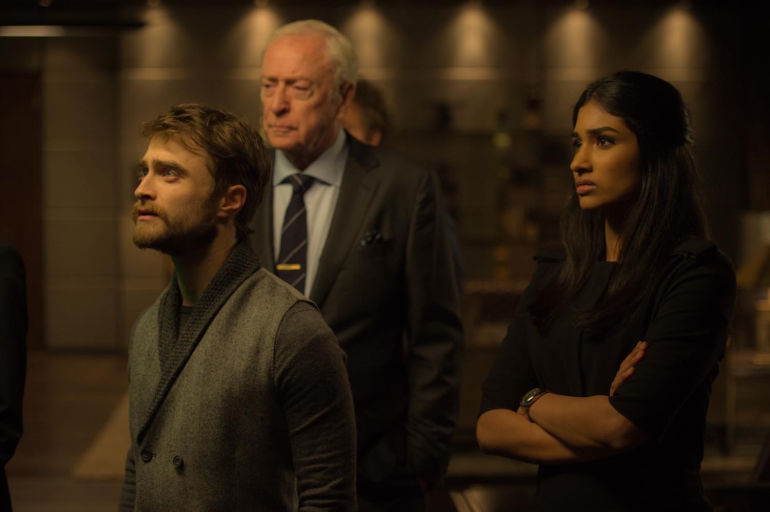 Description: A man standing next to a woman in a suit and tie in a lobby with other people looking on.