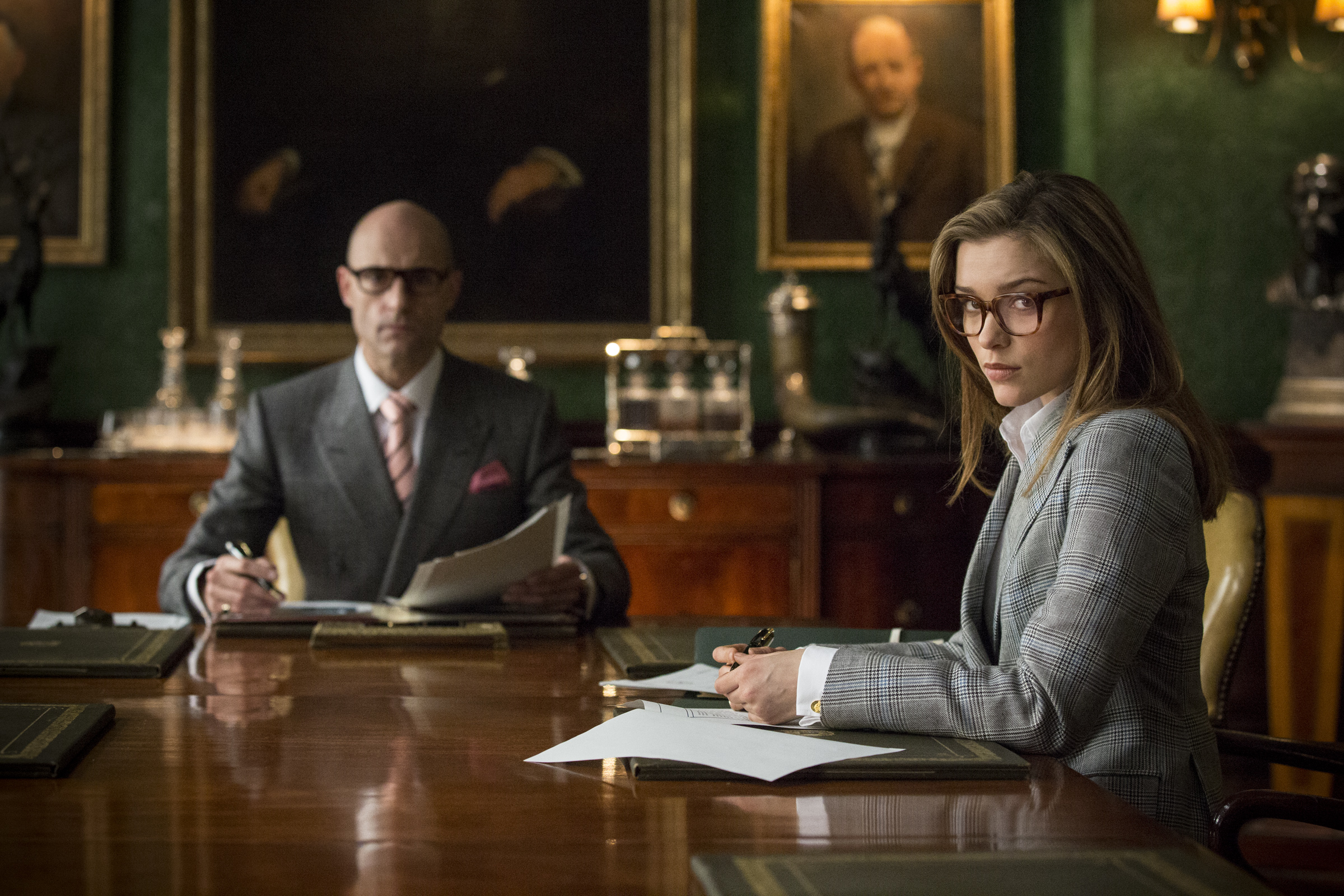 Description: A man and a woman sitting at a table in a room with paintings on the wall and a man in a suit and tie.