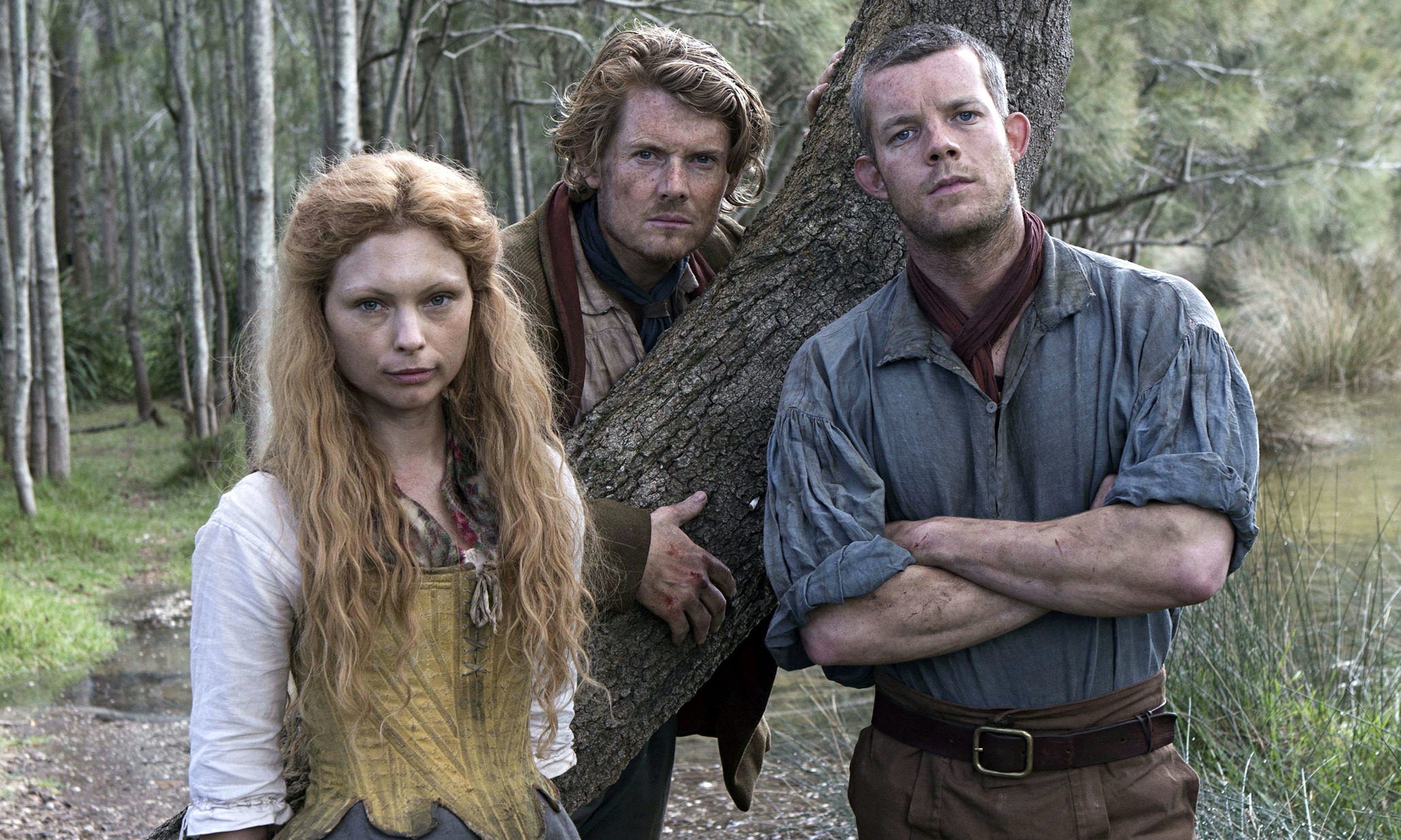 Description: A man and a woman standing next to a tree in a forest with a stream behind them and a man with long hair.