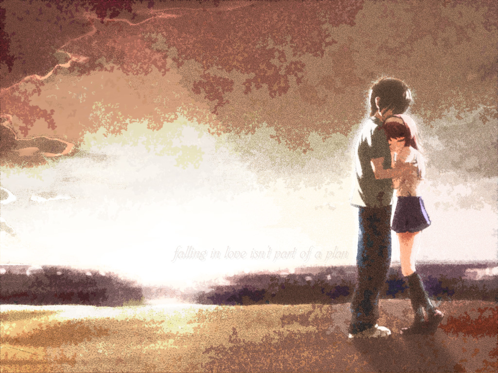 Description: A man and a woman standing next to each other under a tree with a sunset in the background and a sky with clouds.