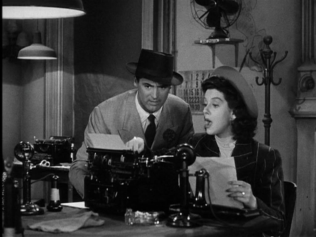 Description: A man and woman are looking at a typewriter in a room with a lamp on the wall and a lamp on the floor.