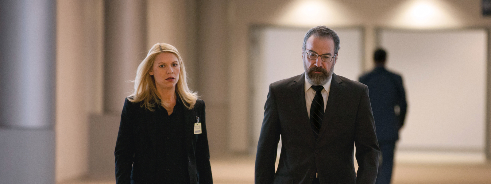 Description: A man and a woman walking down a hall together in suits and ties.