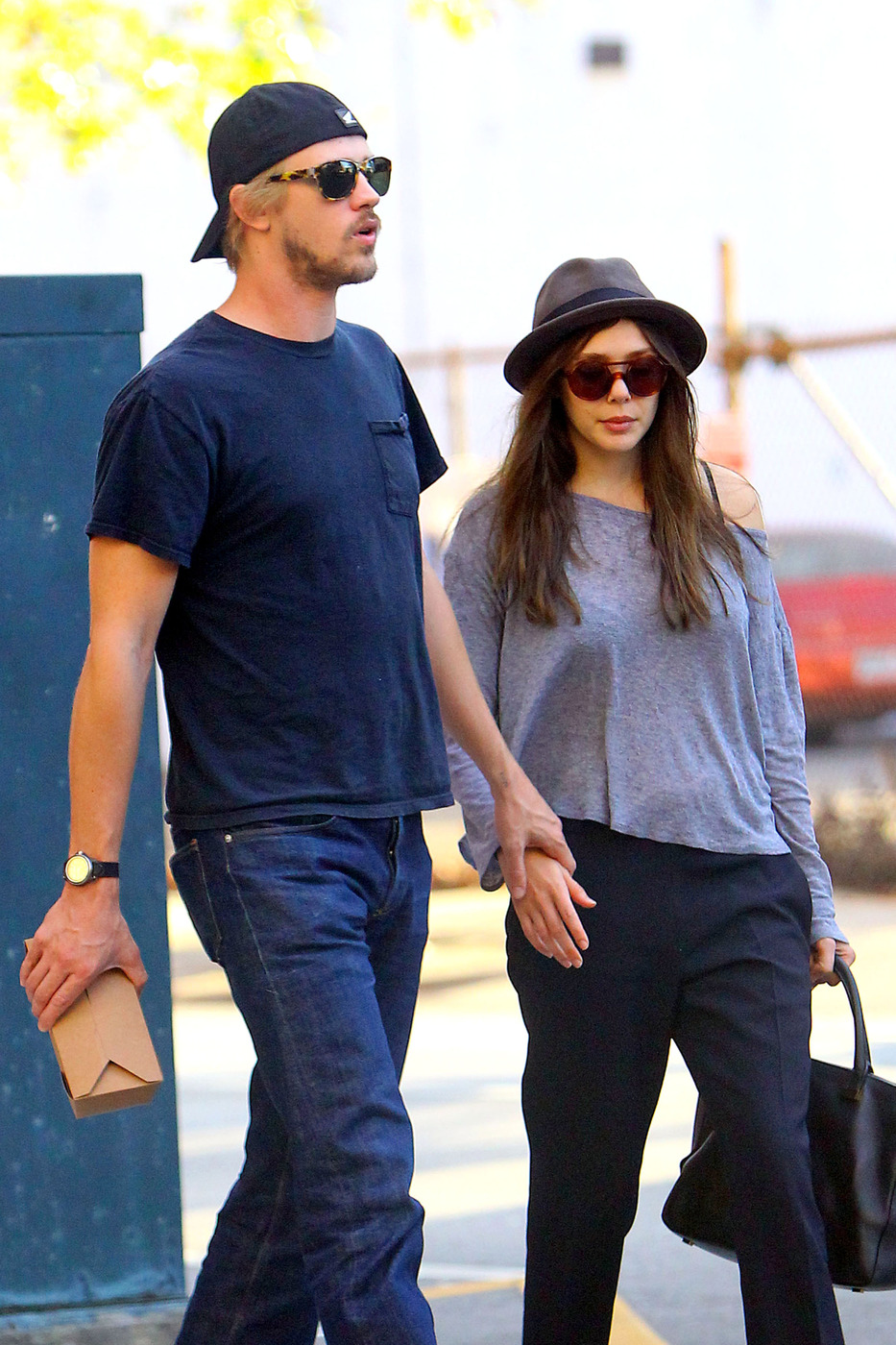 Description: A man and a woman walking down a street holding hands and wearing hats and sunglasses.