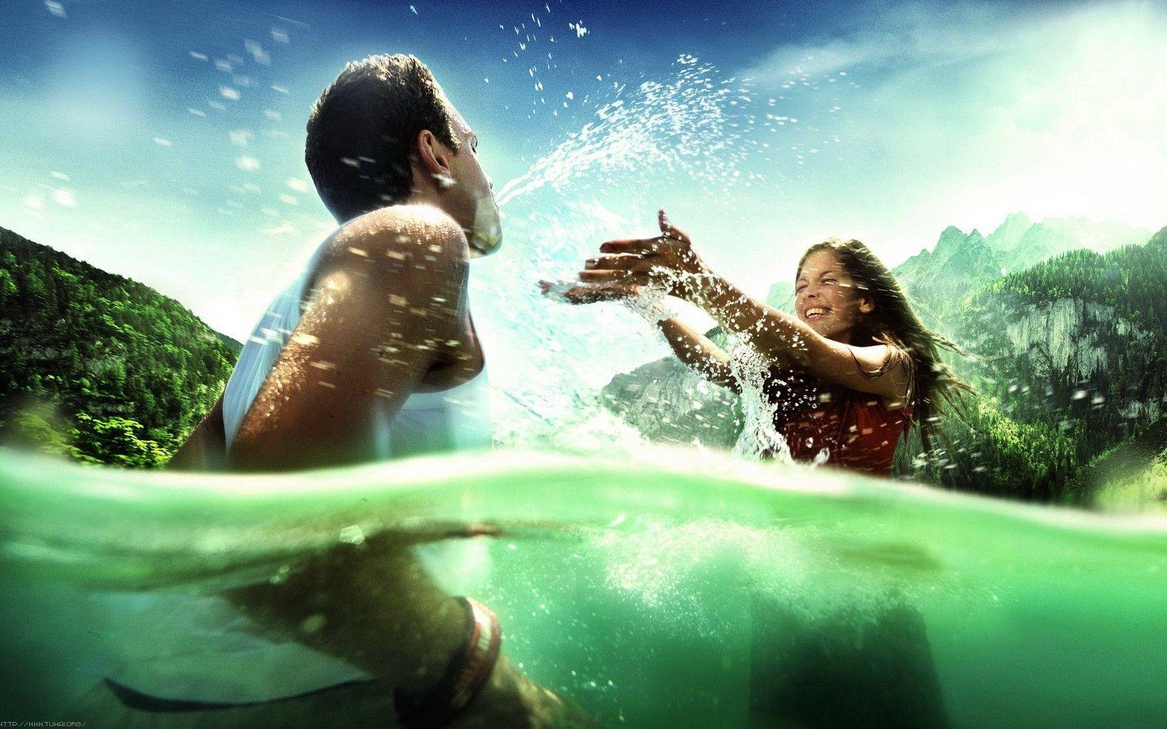 Description: A man and a woman are in the water with a bottle of water in their hand and a mountain in the background.