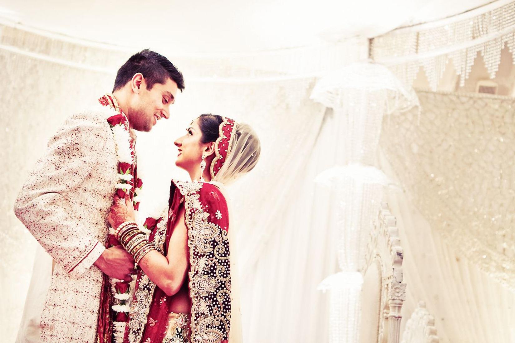 Description: A man and woman standing next to each other in front of a white backdrop with a white curtain and a white curtain.