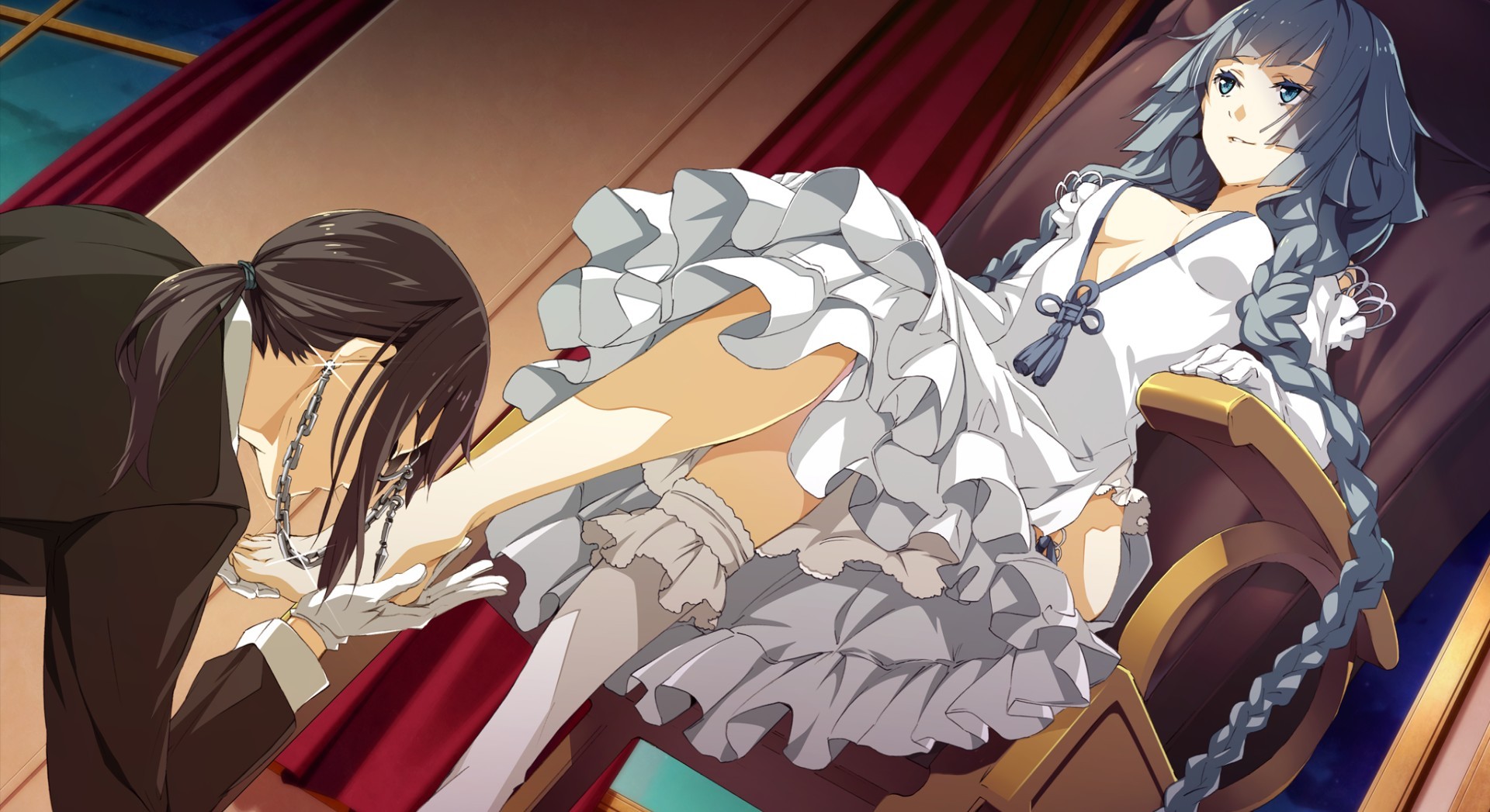 Description: A man and a woman in a white dress sitting on a chair in front of a red curtain and a window.