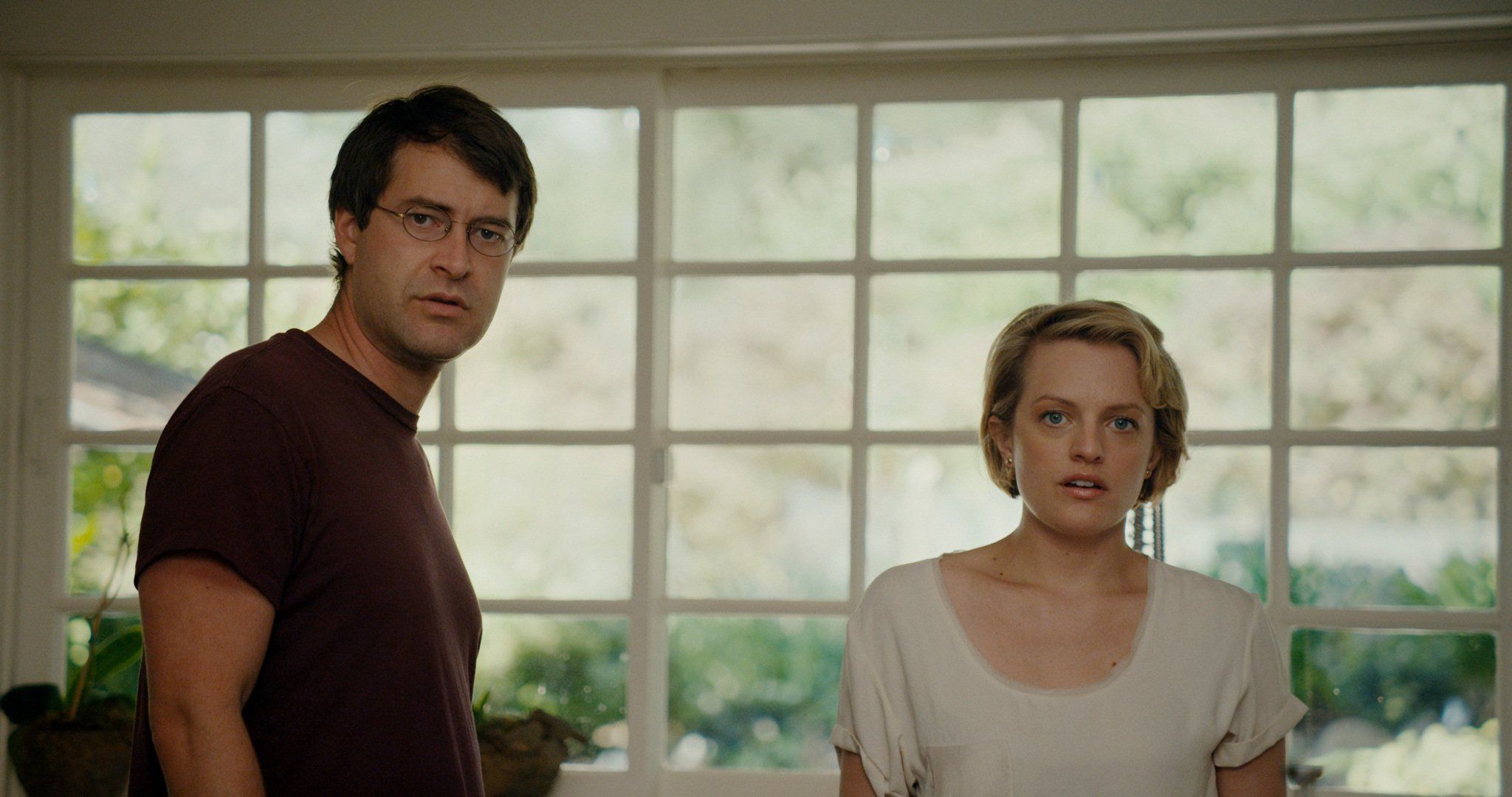 Description: A man and a woman standing in front of a window with a cat on the floor in front of them.
