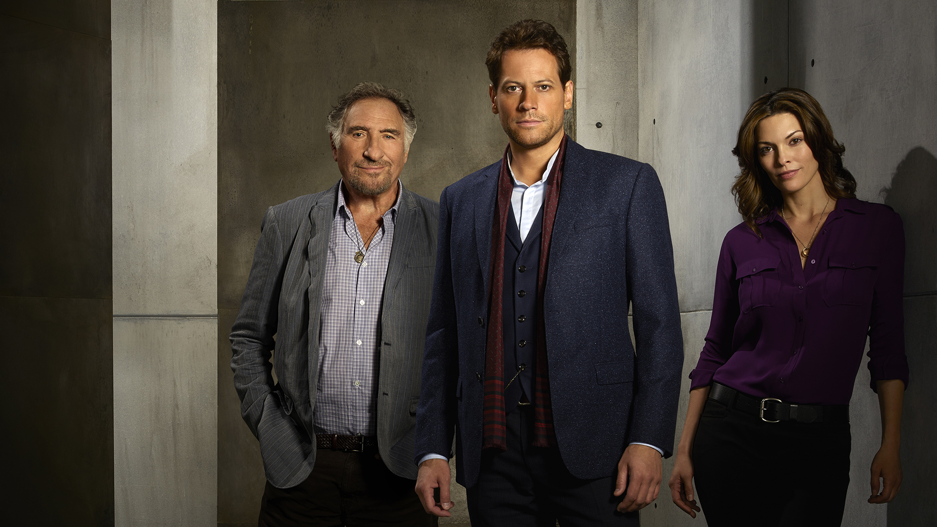 Description: A man and two women standing next to each other in a room with a wall behind them and a man in a suit and tie.