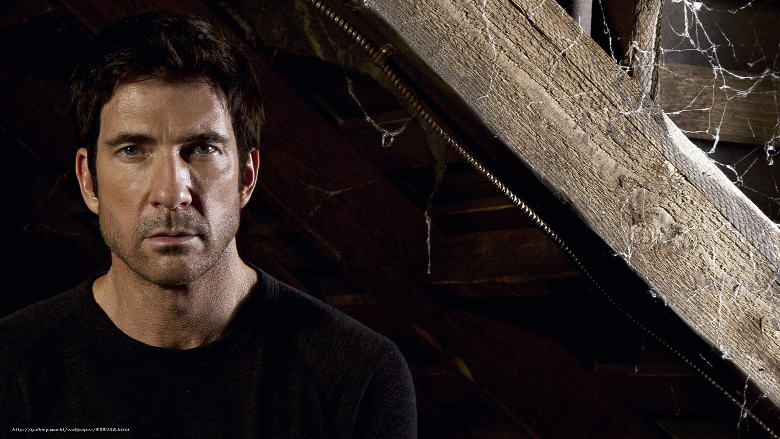 Description: A man standing in front of a wooden structure with a spider web on it's side and a black shirt on.