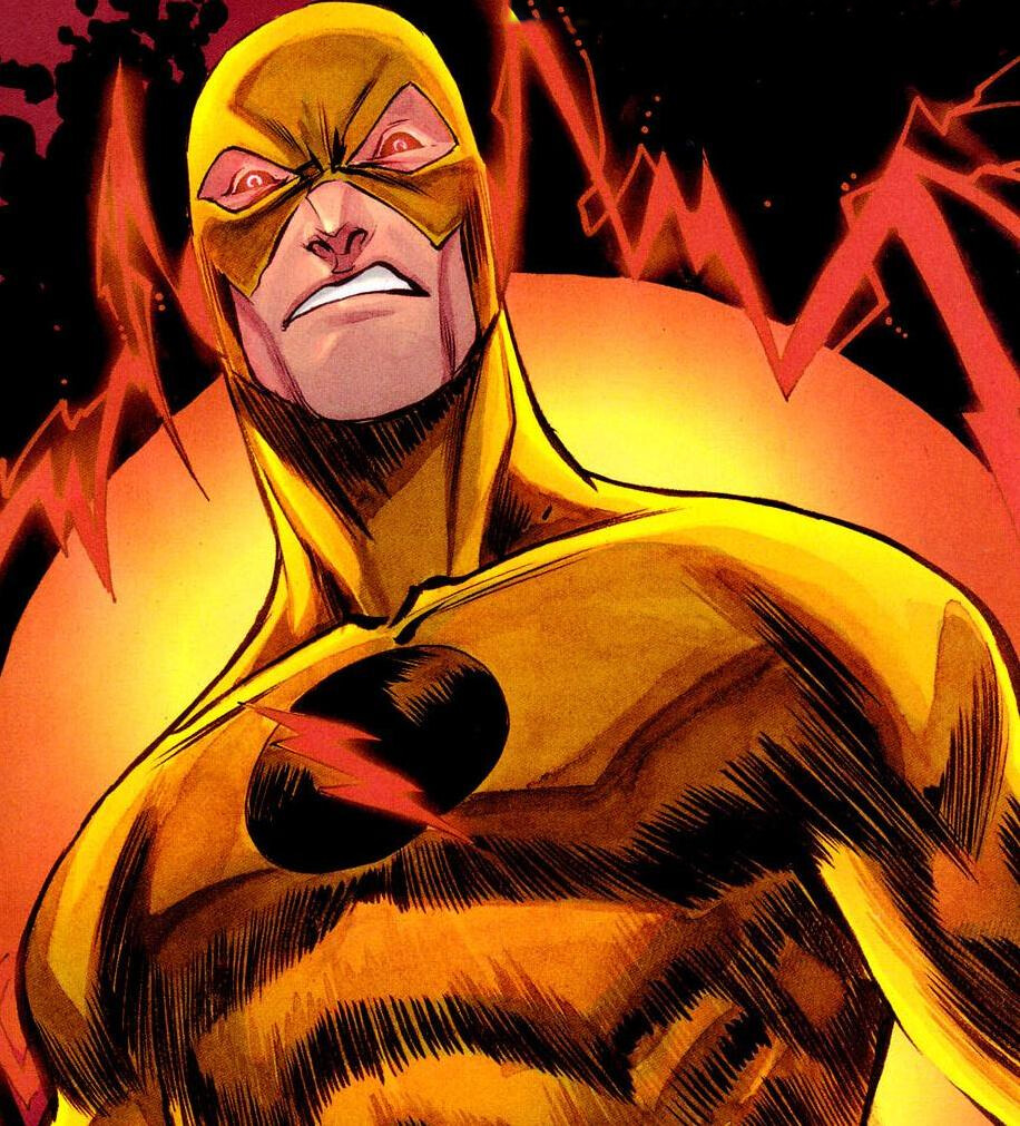 Description: A man in a yellow costume with a red background and a red flash behind him.