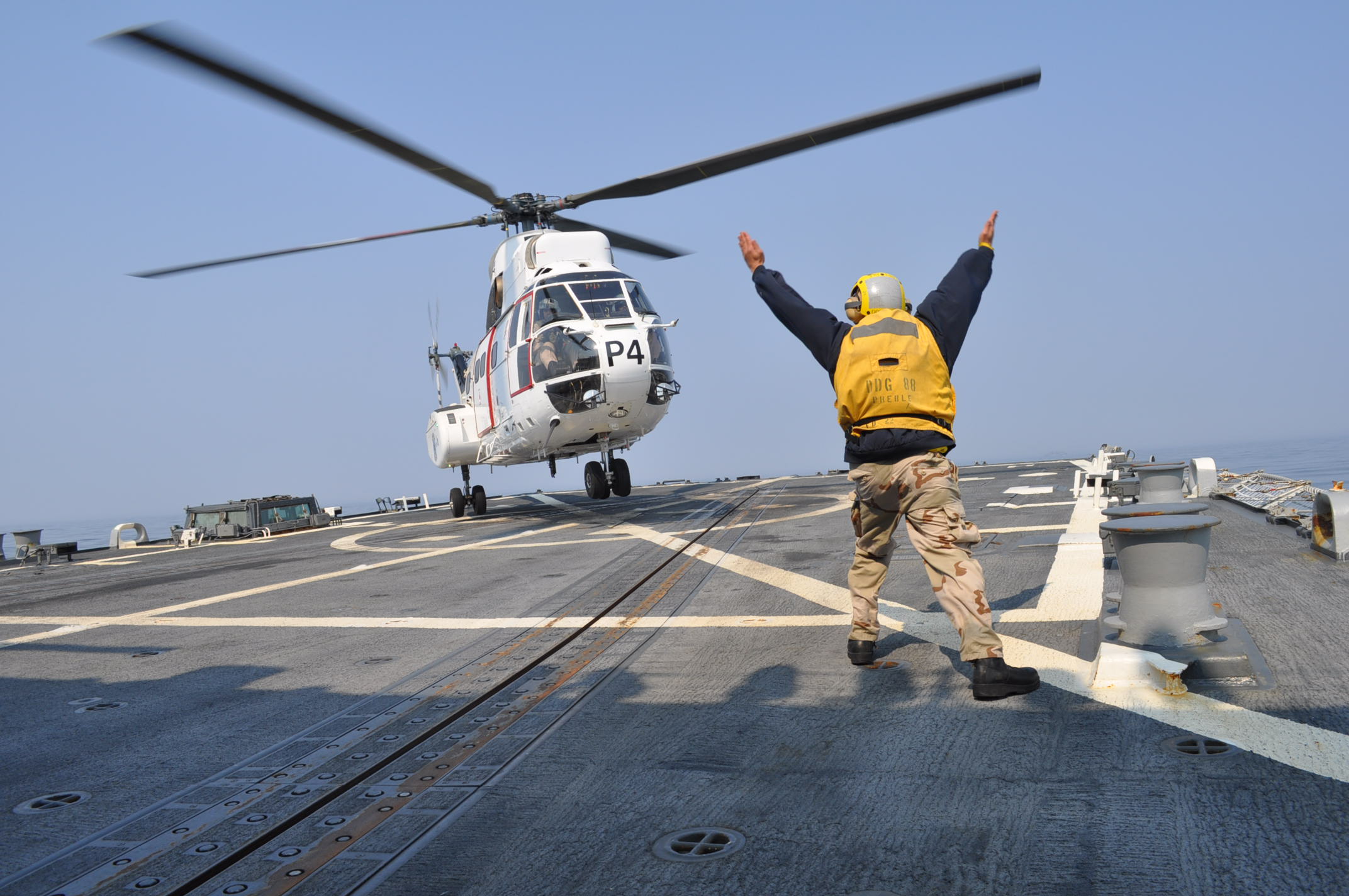 Description: A man in yellow jacket standing on a ship with a helicopter in the background and a helicopter landing on the deck.