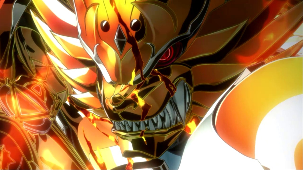 Description: A man in a yellow outfit with a sword in his hand and a red and yellow background with a red and yellow design.
