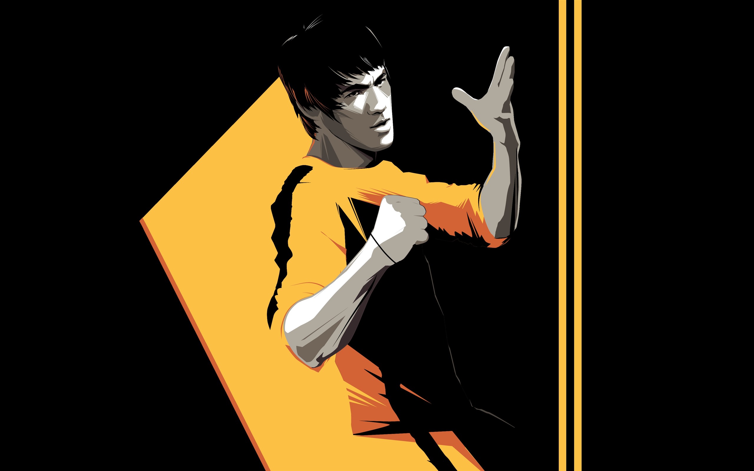 Description: A man in a yellow shirt is holding a black object in his hand and a yellow and black background.