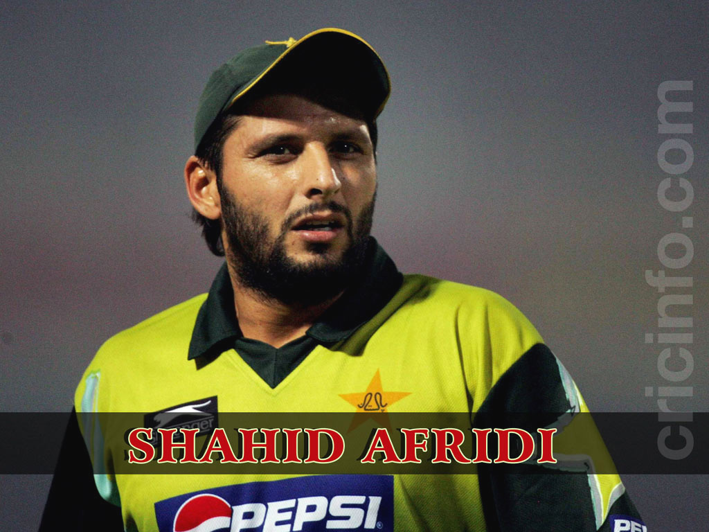 Description: A man in a yellow shirt and a green hat with a name tag on it that says shaid afrid.