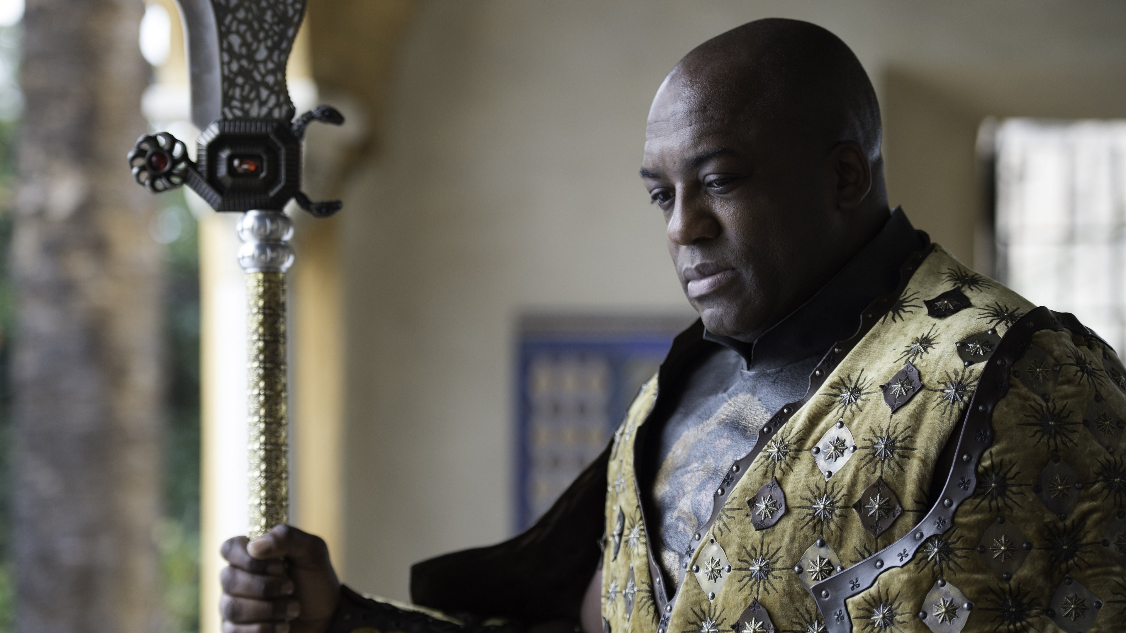 Description: A man in a yellow shirt holding a sword in his hand and looking at the camera with a serious look on his face.