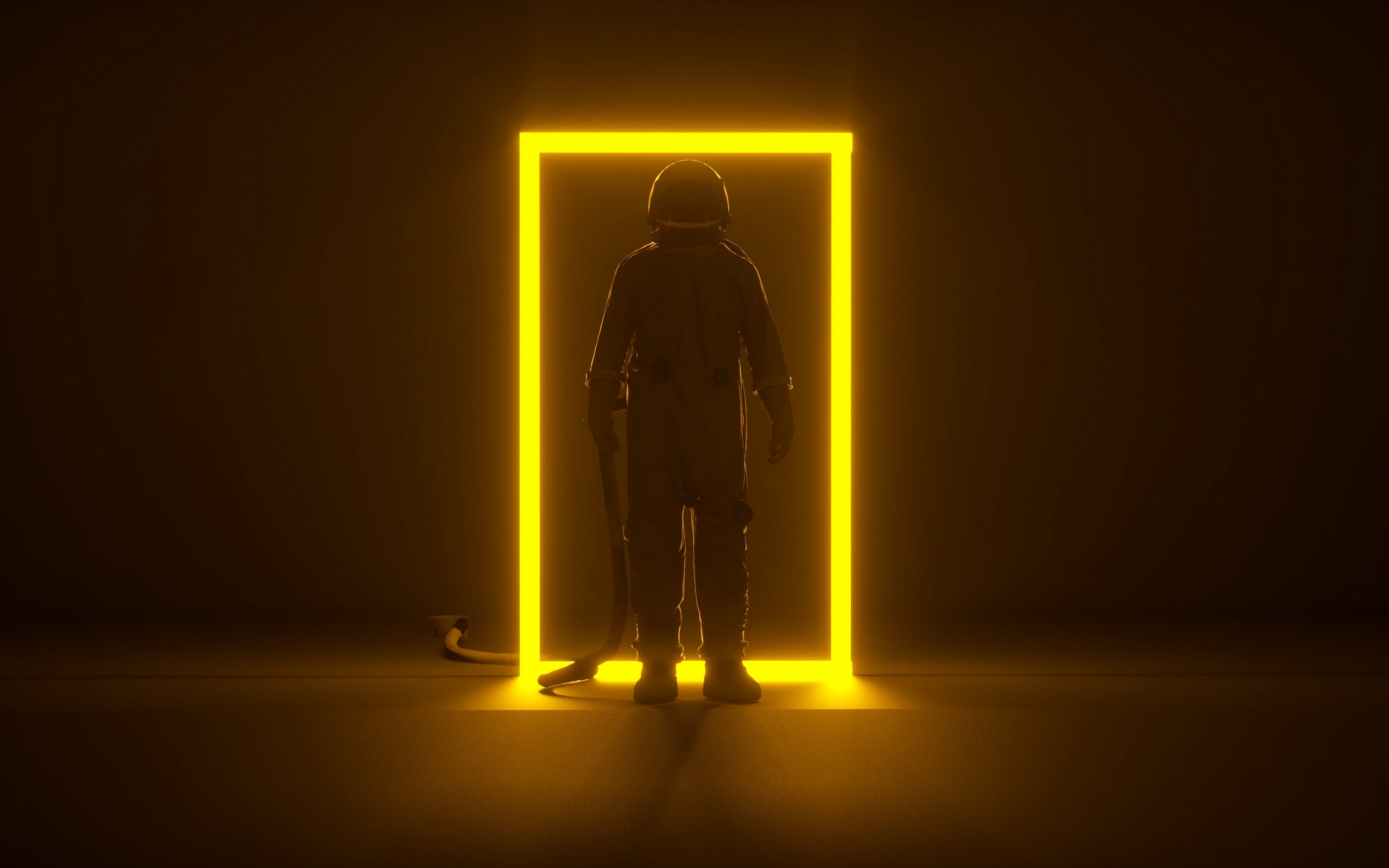 Description: A man standing in front of a yellow door with a cat on the floor in front of him and a cat on the floor in the background.