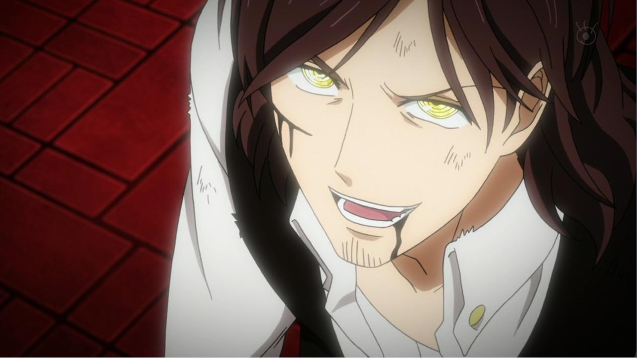 Description: A man with long hair and yellow eyes looking at the camera with a smile on his face and a red brick wall behind him.