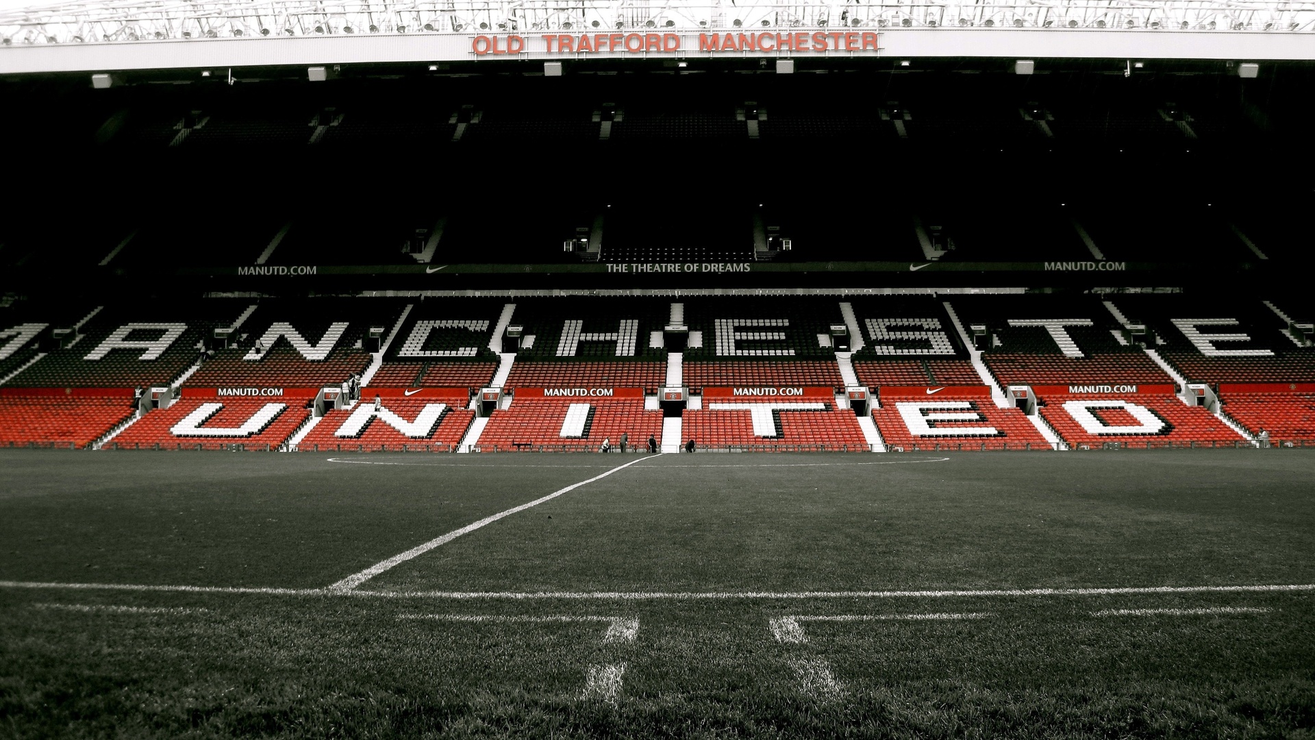 Description: A black and white photo of a soccer field with a red and white banner on it that reads manchester united.