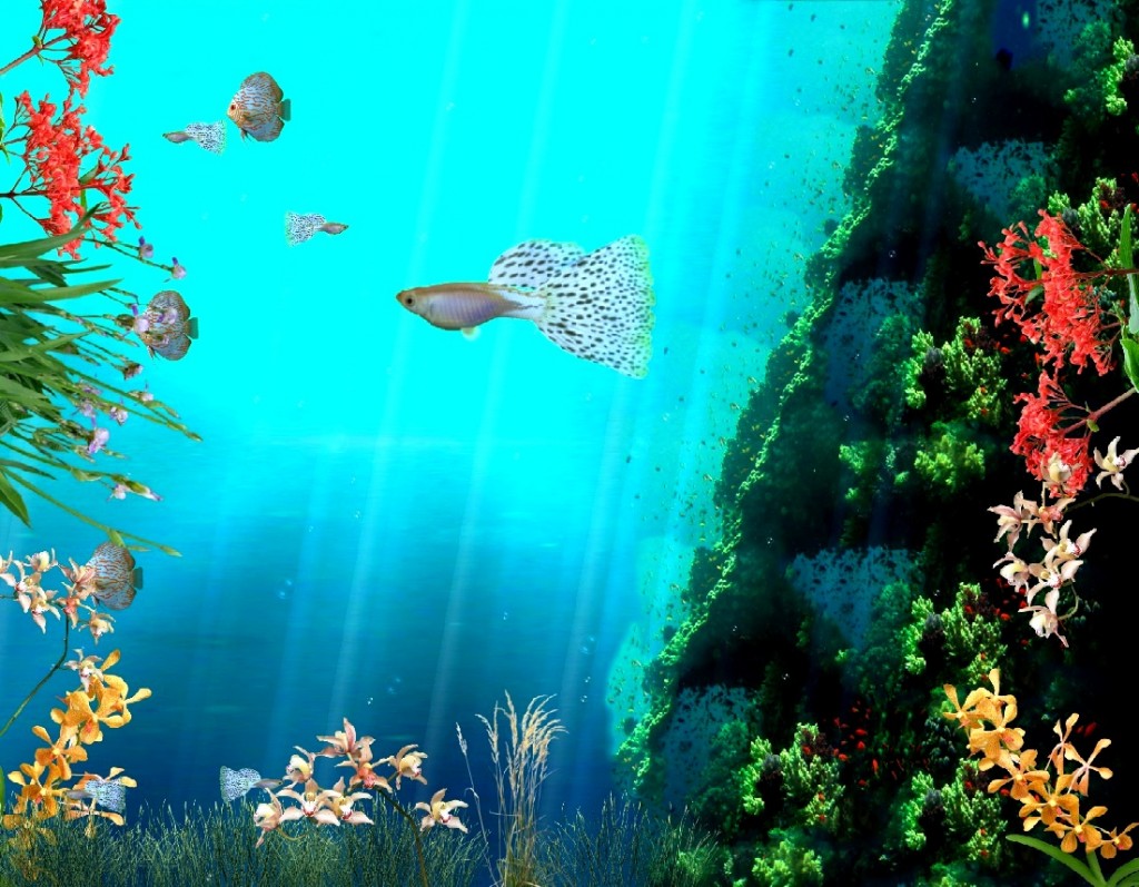 Description: A painting of a fish and other marine life in a blue ocean with corals and plants on the bottom.