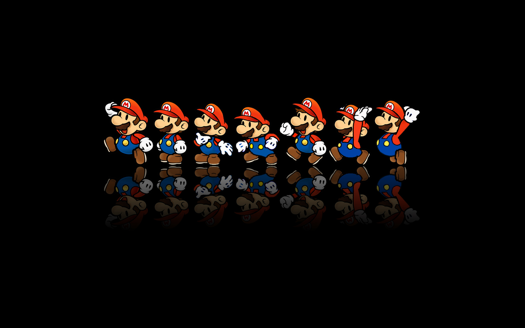 Description: A group of mario bros characters are lined up in a row on a black background with a reflection of them.