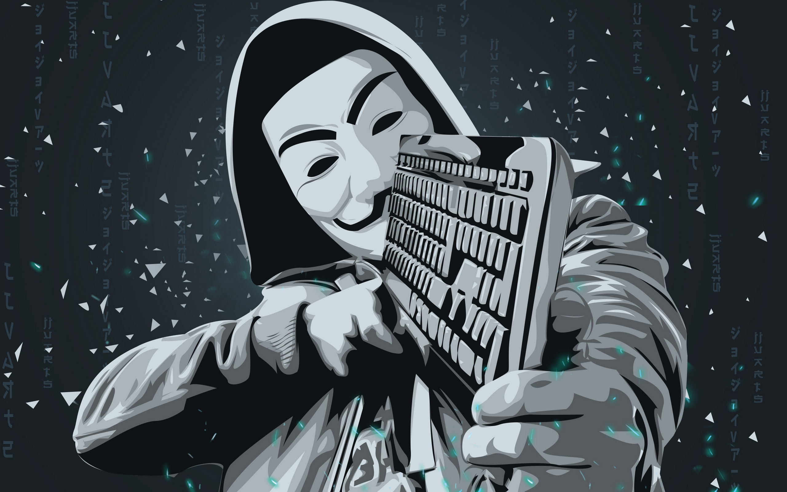 Description: A person wearing a mask holding a computer keyboard in front of a black background with white letters and a blue background.