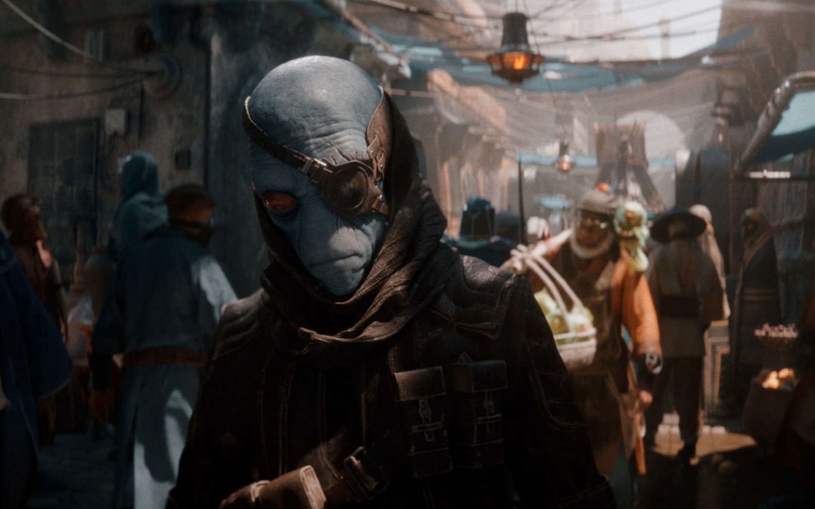 Description: A man in a mask and a group of people in a street with a light on and a street lamp.