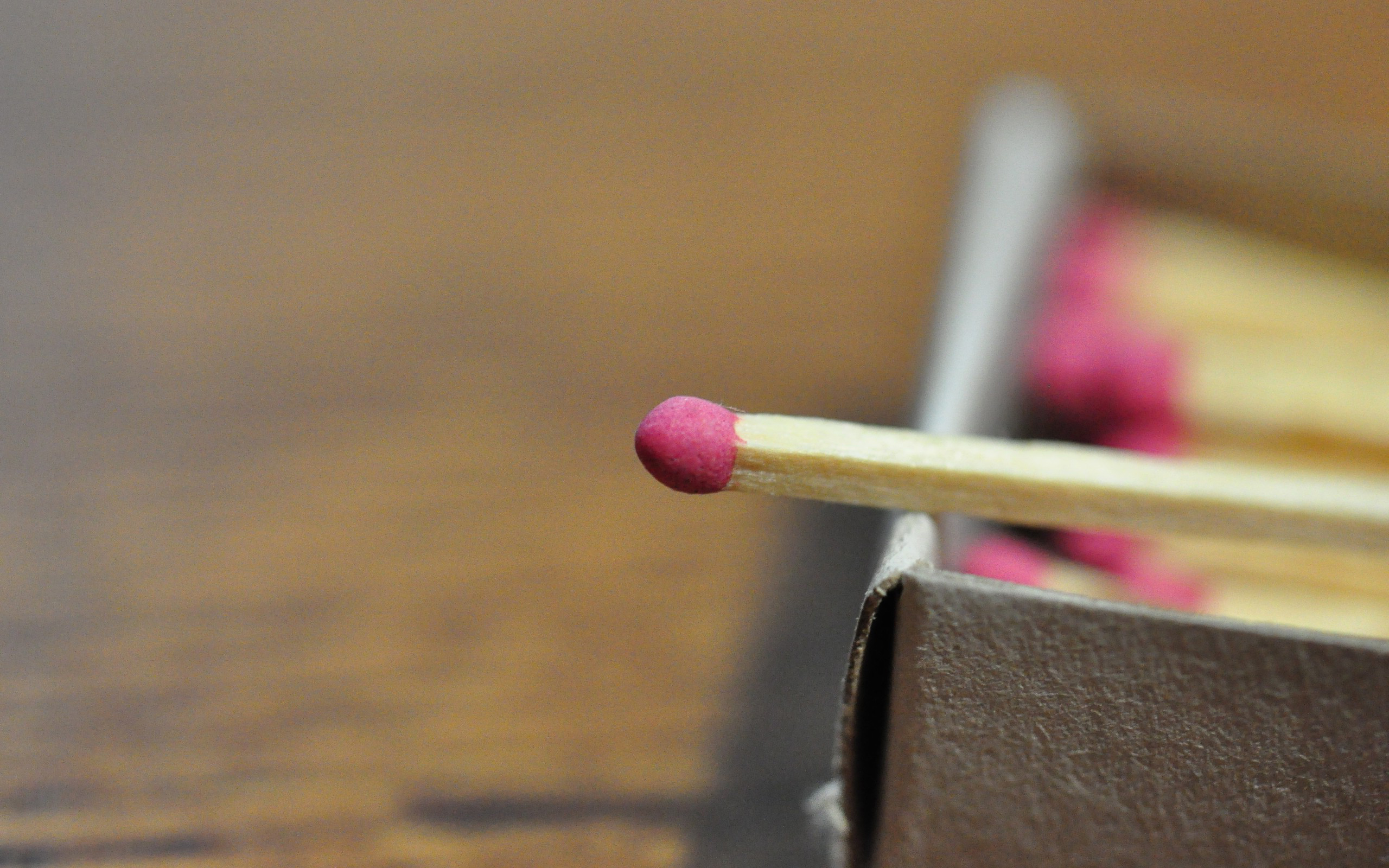 Description: A close up of a match stick in a box of matches on a table with a wooden surface and a wooden table.
