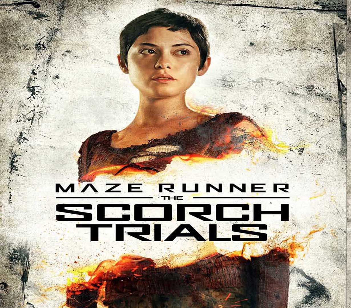 Description: A poster of maze runner the scorch trials with a woman in a dress on fire and a man in a suit on fire.
