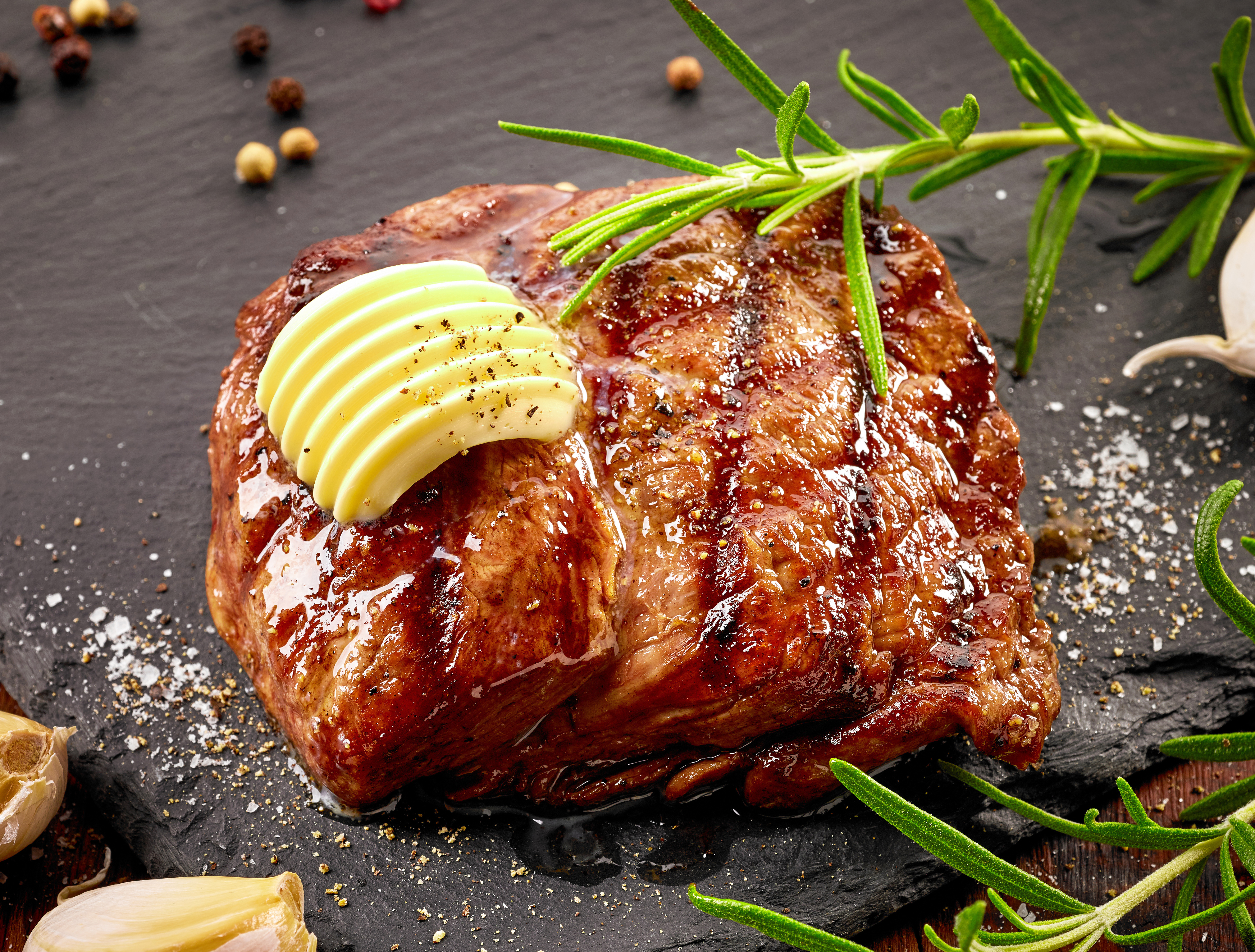 Description: A piece of meat with a slice of apple on top of it and some garlic and garlic on the side.