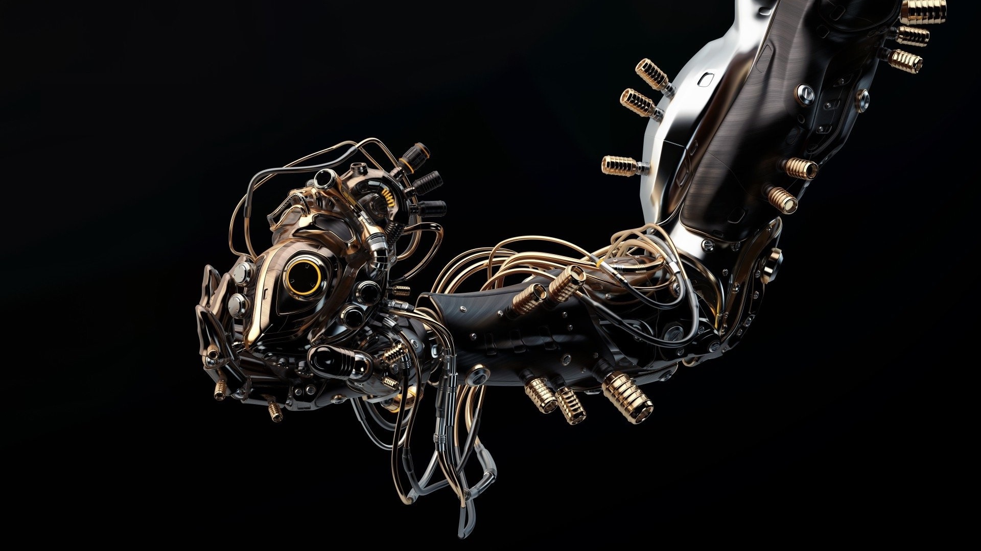 Description: A mechanical arm with a black background and a black background with a black background and a black background with a black background and a black background with a gold.