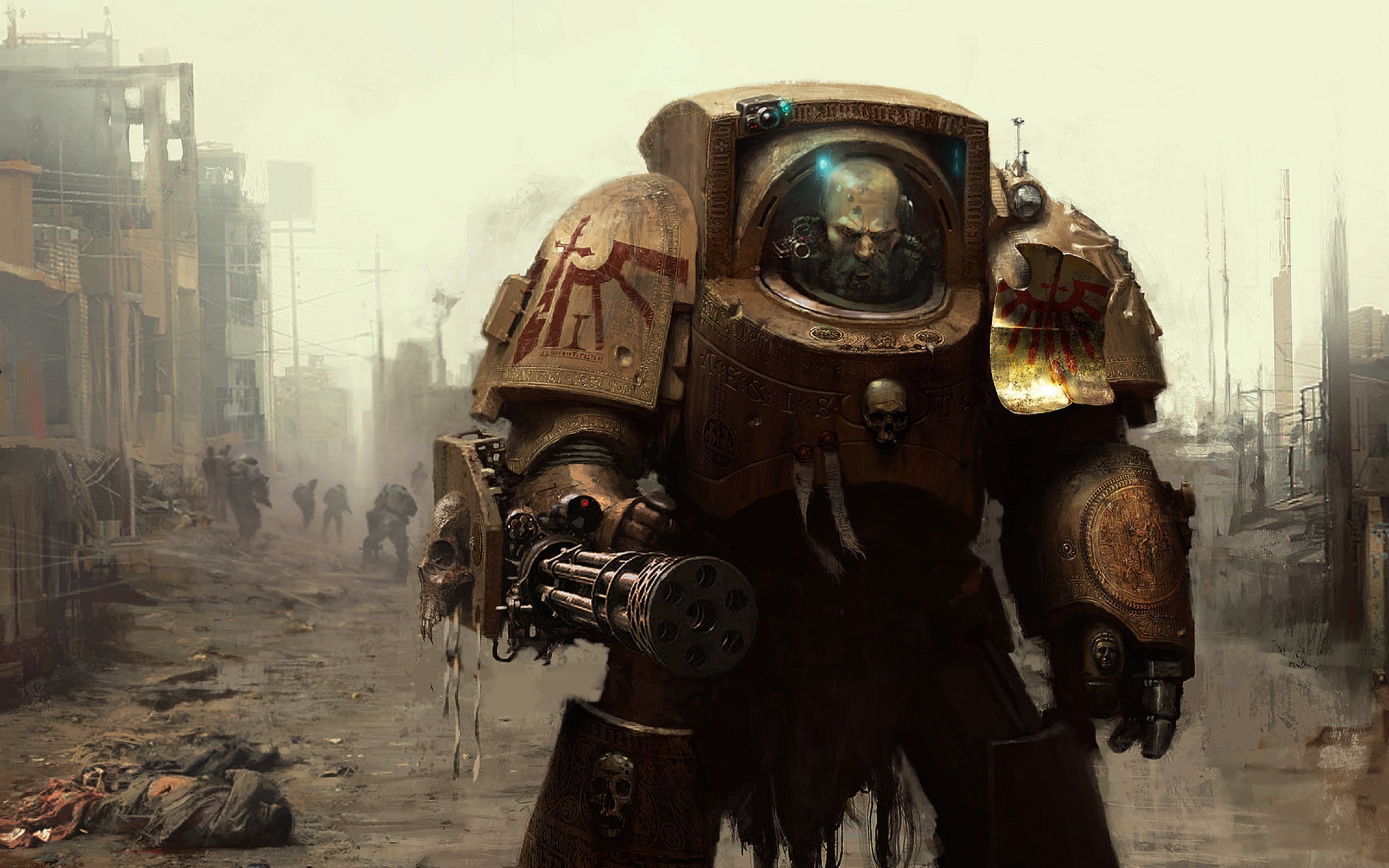 Description: A man in a mechanical suit walking through a dirty street with a machine gun in his hand and a skull on his chest.