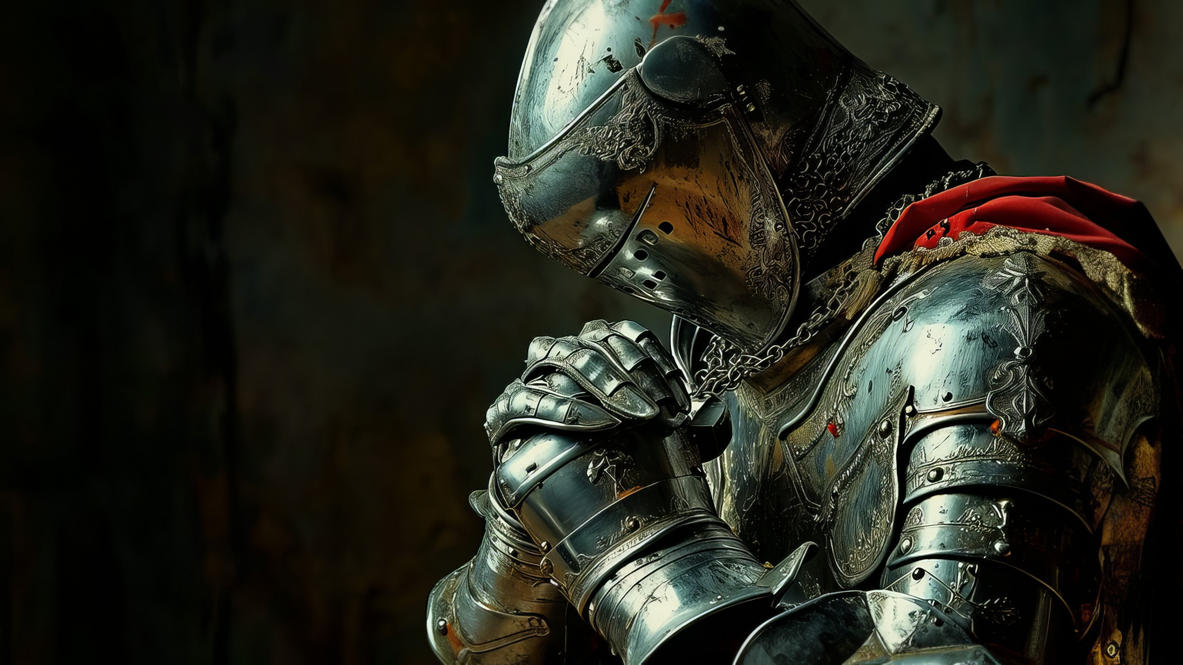 Description: A man in a suit of armor holding his hands together and looking down at his chest and chest.