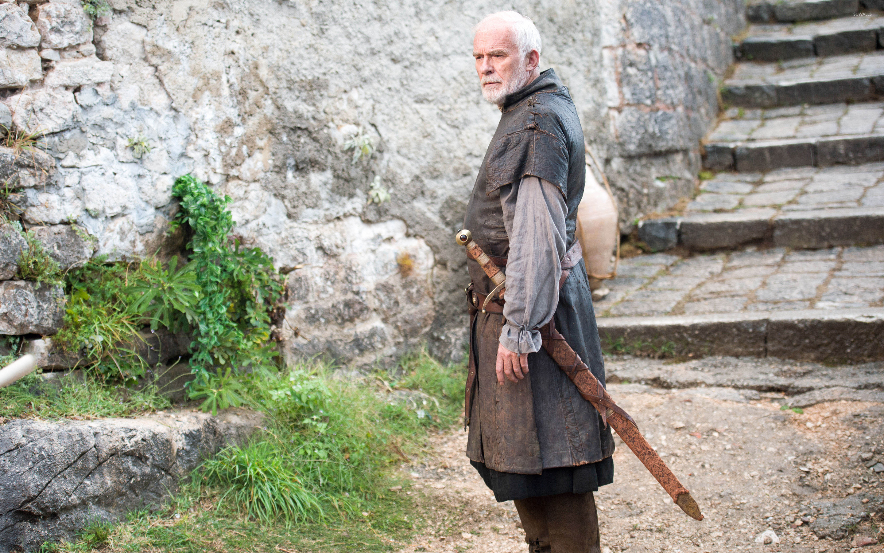 Description: A man in a medieval outfit standing in front of a stone wall with a sword in his hand and a helmet on his head.