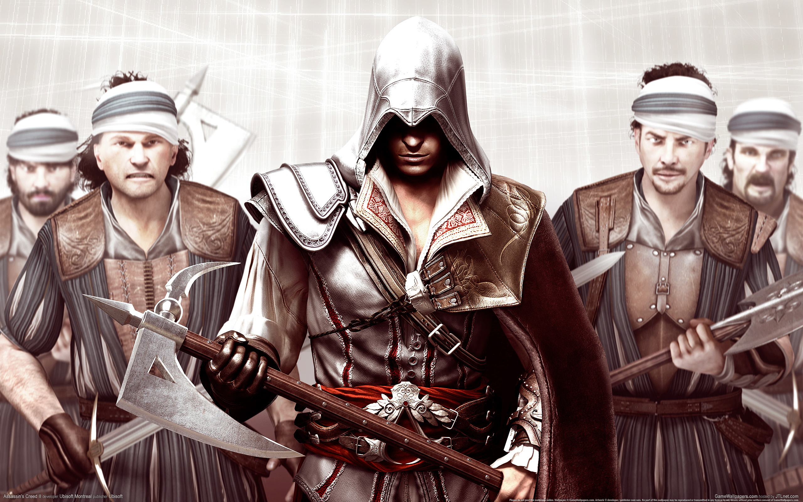 Description: A group of men in medieval clothing holding axes and swords in front of a wall with a white background.