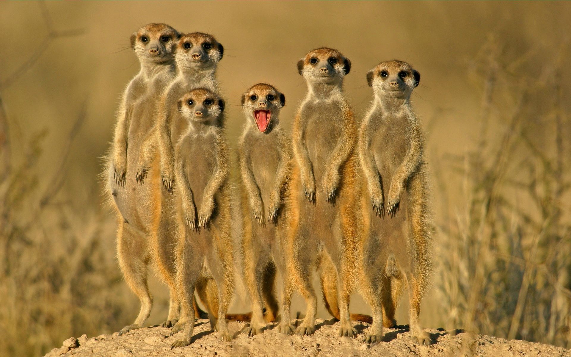 Description: A group of meerkats standing on a hill with their mouths open and their mouths wide open.