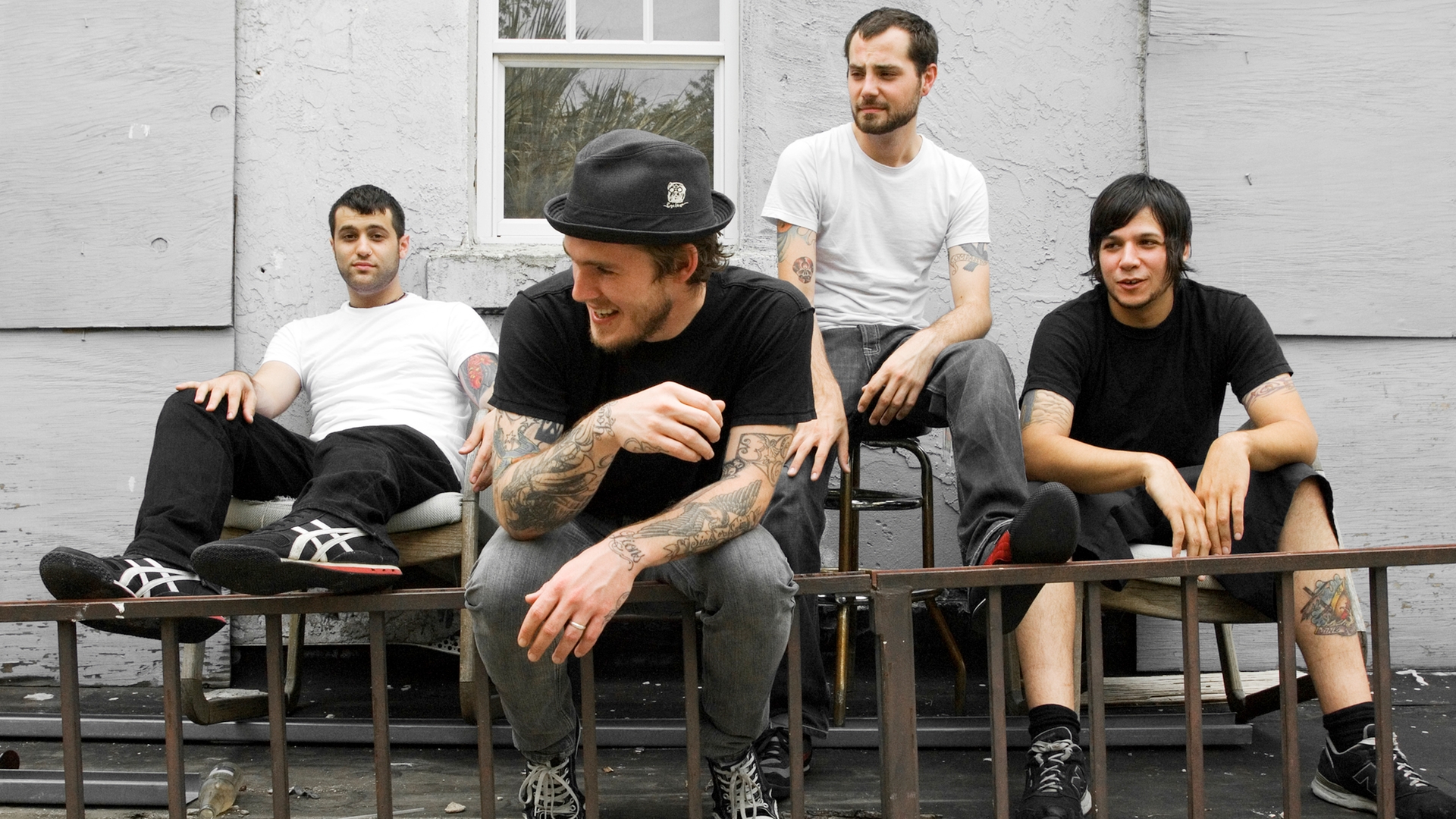 Description: A group of men sitting on top of a bench next to each other on a sidewalk near a building.