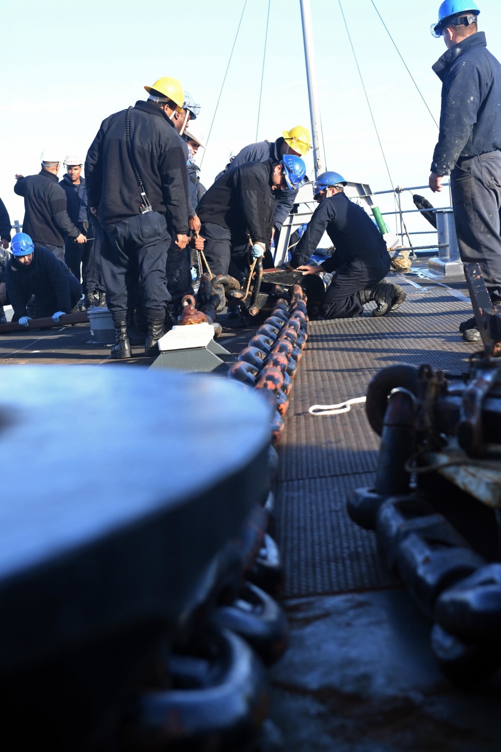 Description: A group of men standing on top of a boat next to a boat ramp with a boat in the background.