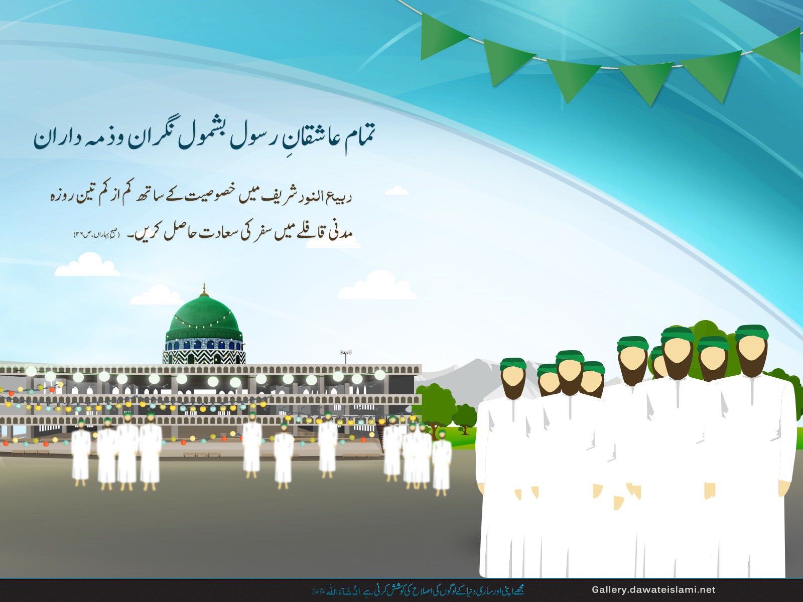 Description: A group of men standing in front of a building with a green dome on top of it and a sky background.