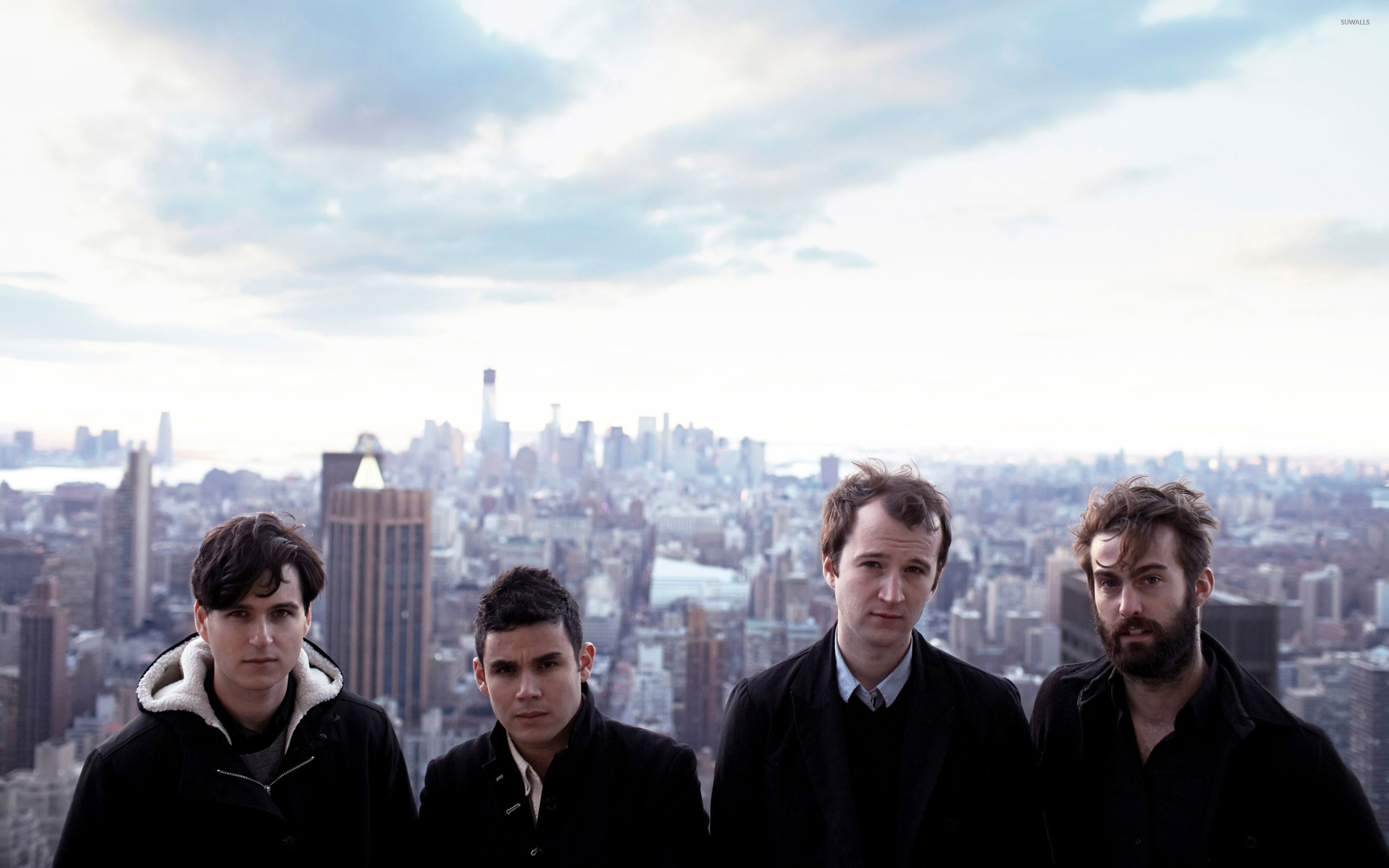 Description: A group of men standing next to each other in front of a city skyline with skyscrapers in the background.