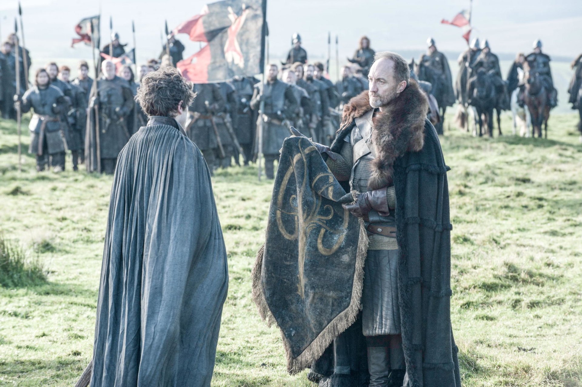 Description: A group of men standing on top of a field next to each other holding a shield and a sword.