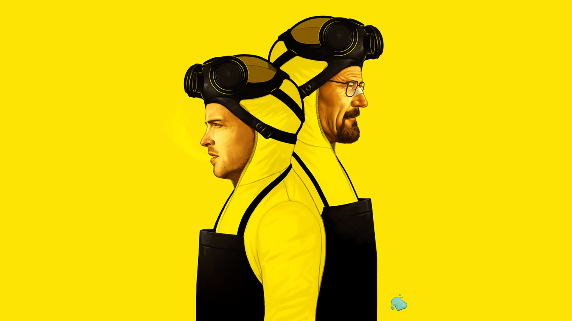 Description: A couple of men wearing goggles and a yellow background with a blue bird in the middle of the image.