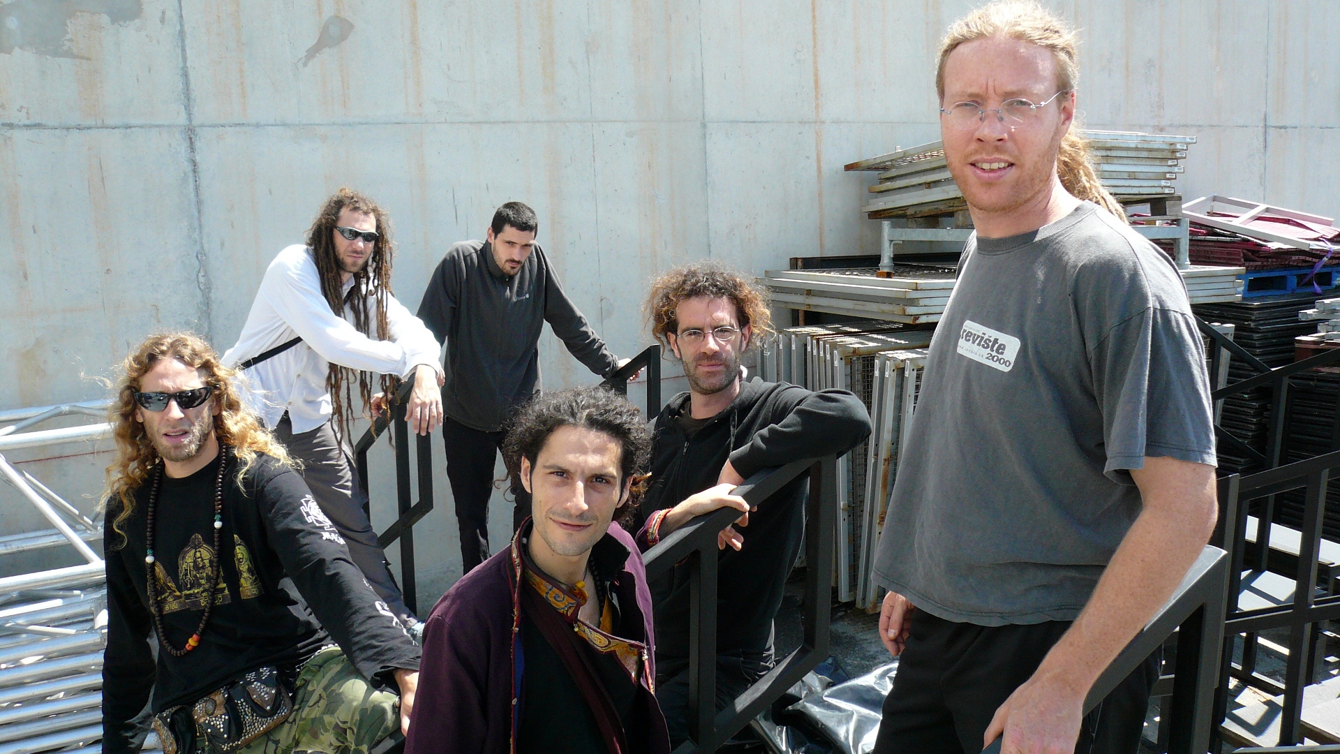 Description: A group of men standing next to each other near a building with a metal fence and a building behind them.