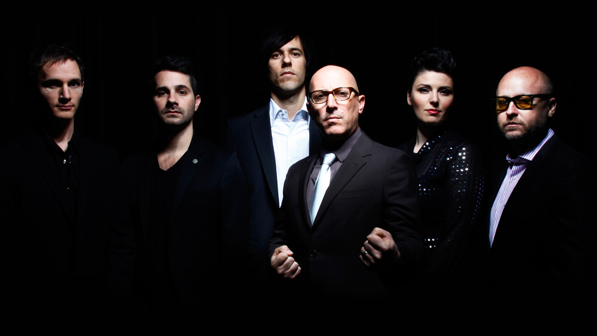 Description: A group of men standing next to each other in a dark room with one man wearing a suit and tie.