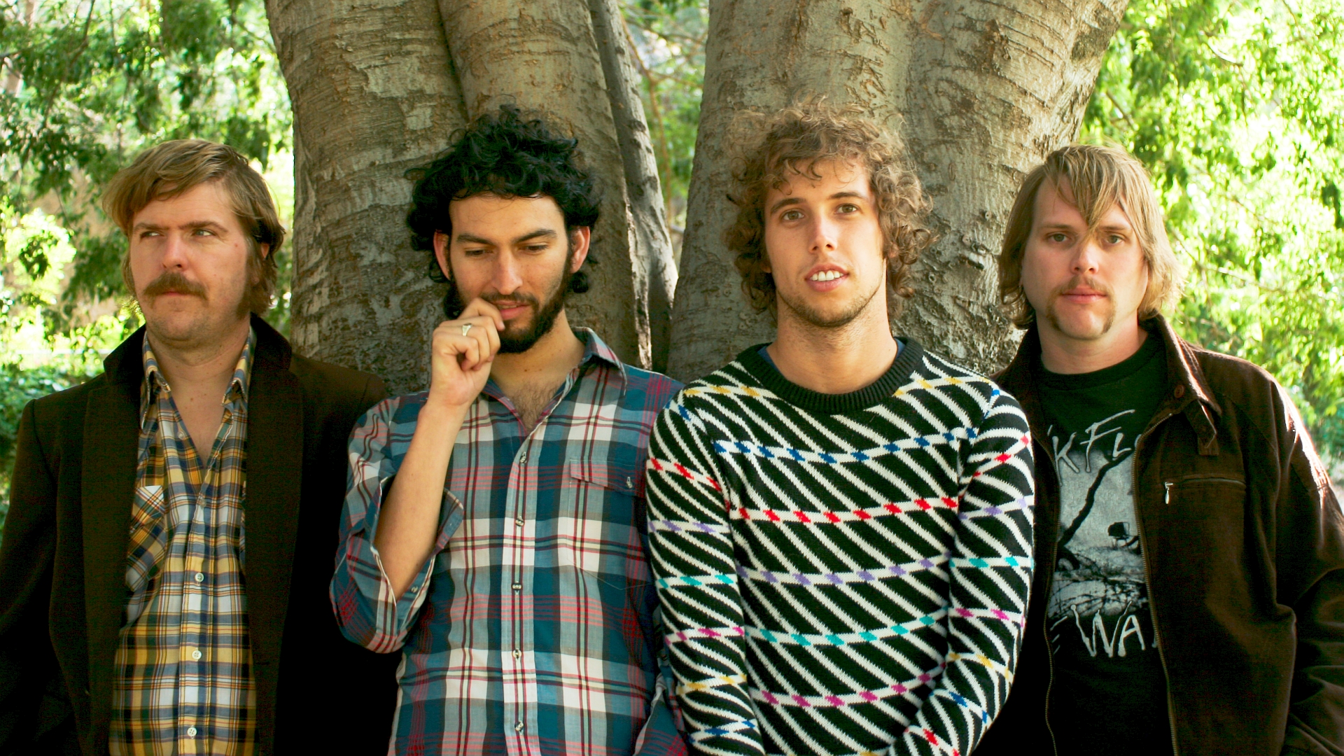 Description: A group of men standing next to each other near a tree in a forest with a man pointing at the camera.