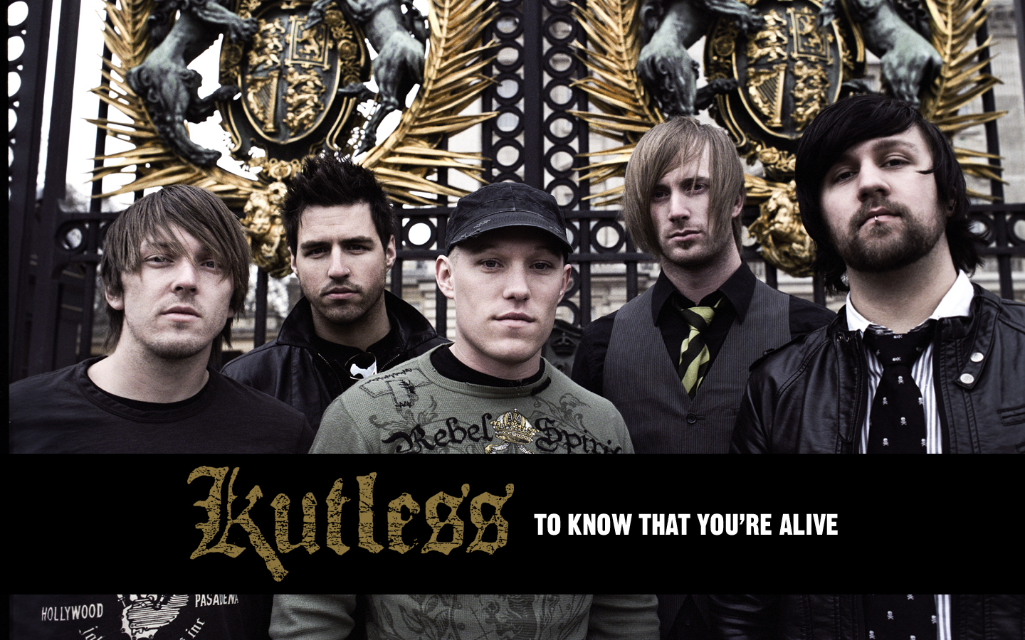 Description: A group of men standing next to each other in front of a gate with a sign that says rules to know that you're alive.